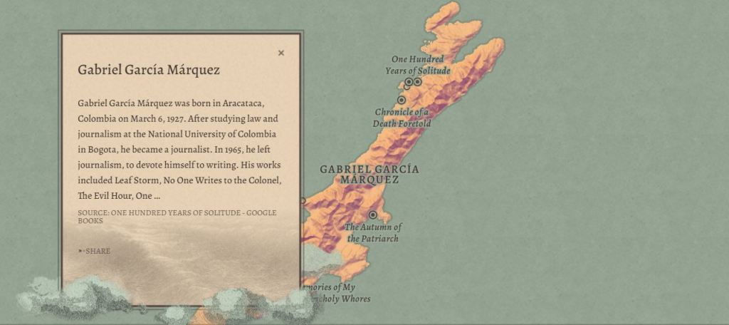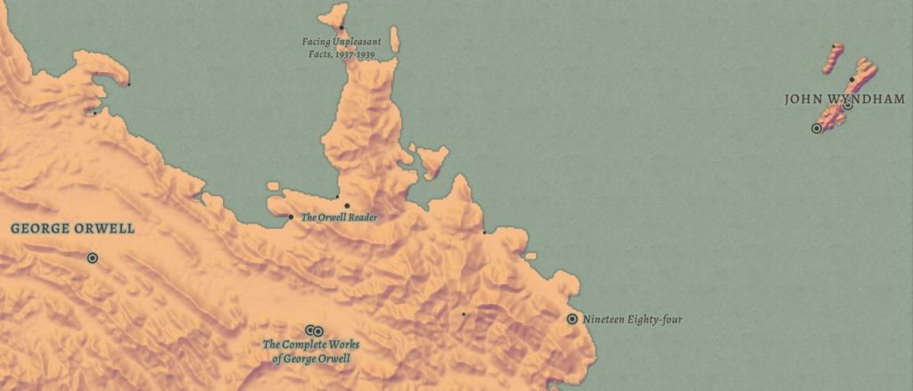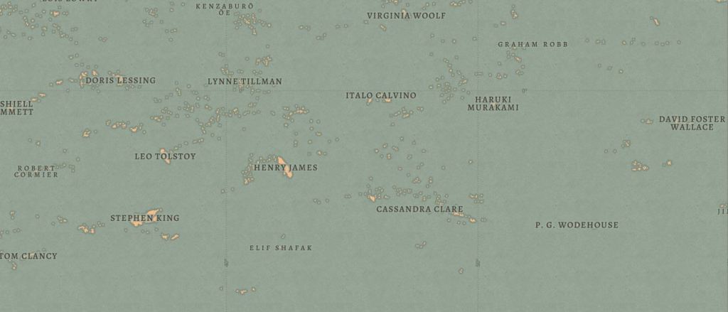 Cada isla representa a un autor. Al acercarnos, descubrimos en ellas puertos y ciudades que en realidad son los títulos de sus obras más destacadas. Es tal el nivel de detalle que incluso esos títulos están localizados sobre el mapa siguiendo un orden lógico.