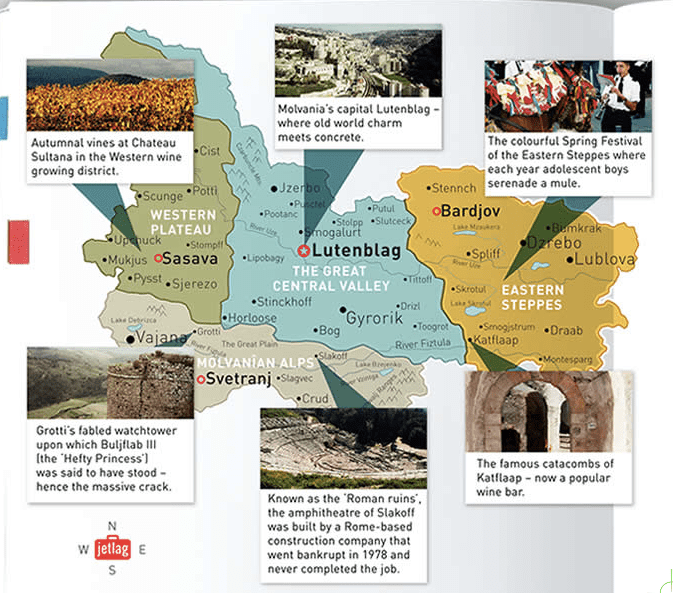 La bandera de Molvanîa es conocida como Trikolor, pese a que solo luce dos colores. El idioma local es muy difícil de aprender. Entre otras cosas, se distingue porque el artículo varía si el género del sustantivo es masculino, femenino, neutro o un tipo de queso.